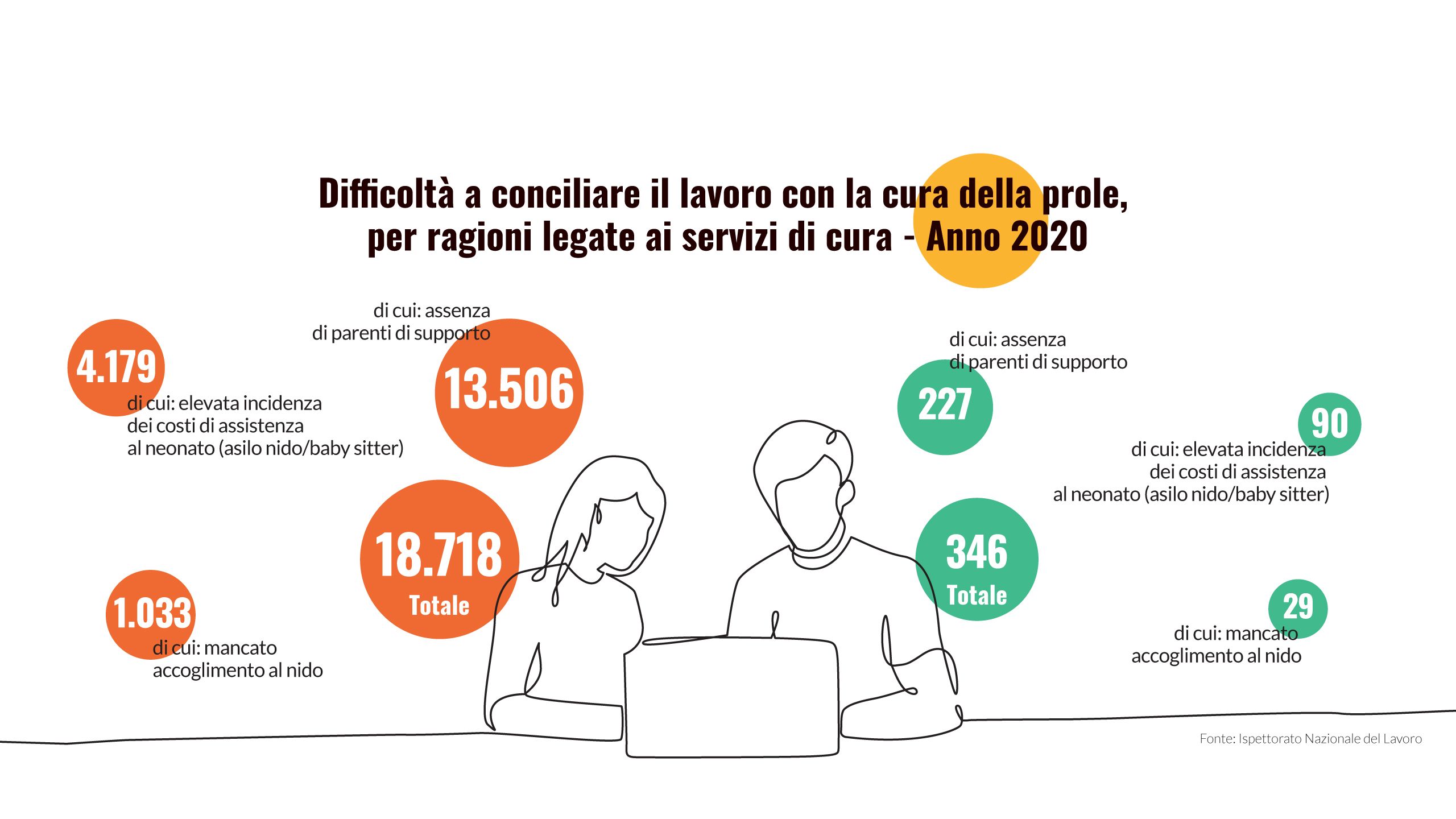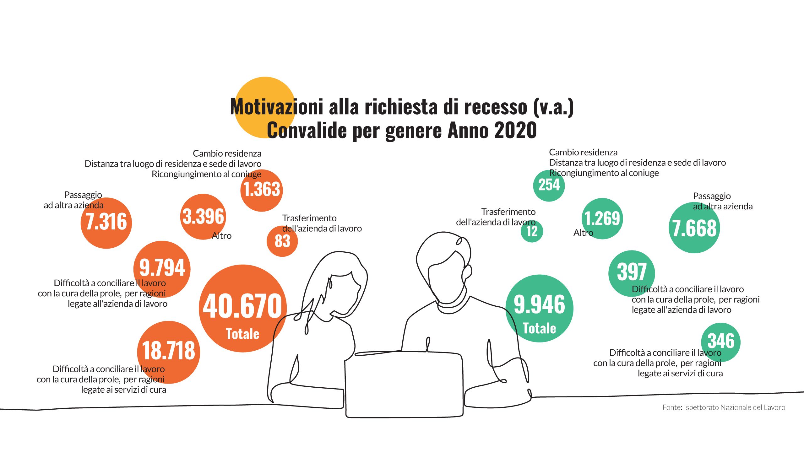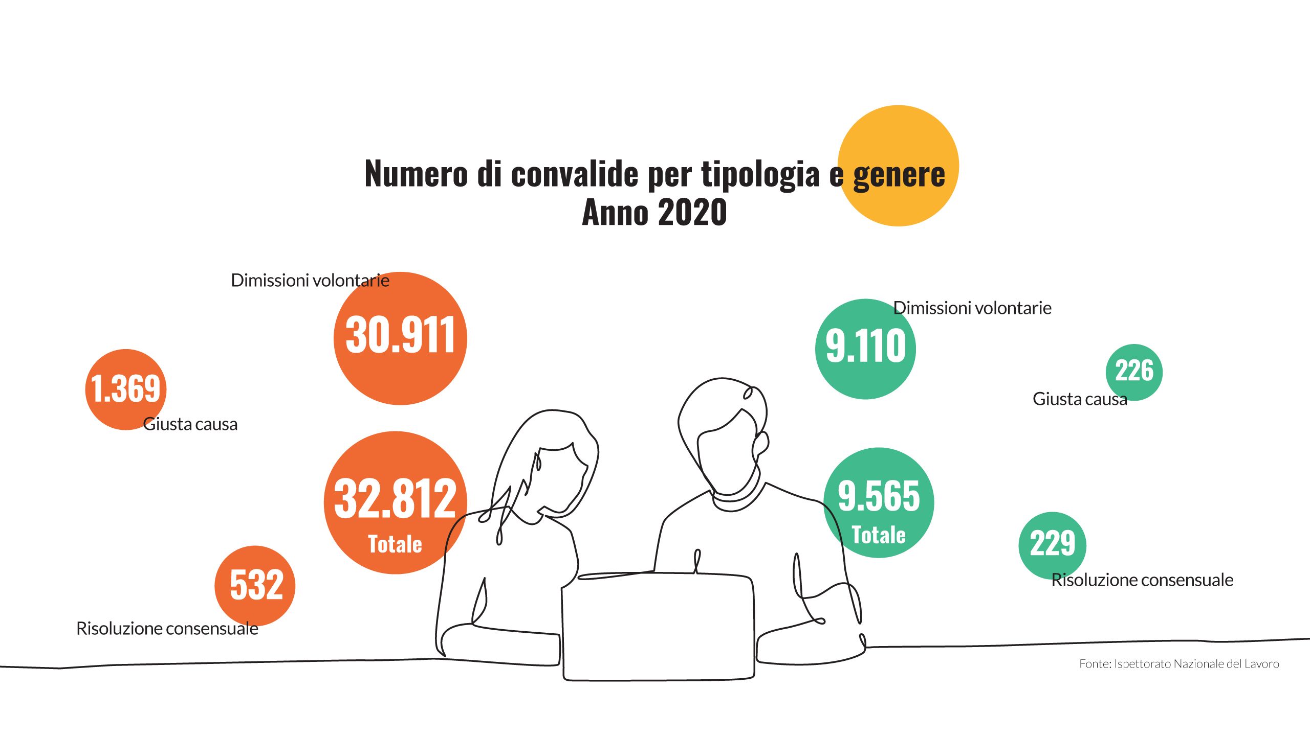 Per quanto attiene ai dati sulle dimissioni volontarie e risoluzioni dei rapporti di lavoro di lavoratrici madri e lavoratori padri (di bambini/e di 0-3 anni), le convalide nel 2020 hanno riguardato complessivamente 42.377 persone, di cui 32.812 (il 77,4%) si riferiscono a madri e 9.565 (22,6%) a padri. La maggior parte dei provvedimenti, 40.021 (il 94%) ha interessato le dimissioni volontarie (per la parte restante, 1.595 erano le risoluzioni per giusta causa e 761 quelle consensuali). Le lavoratrici madri rappresentano il 77,2% (30.911) del complesso delle dimissioni volontarie, a fronte delle 9.110 dei padri.