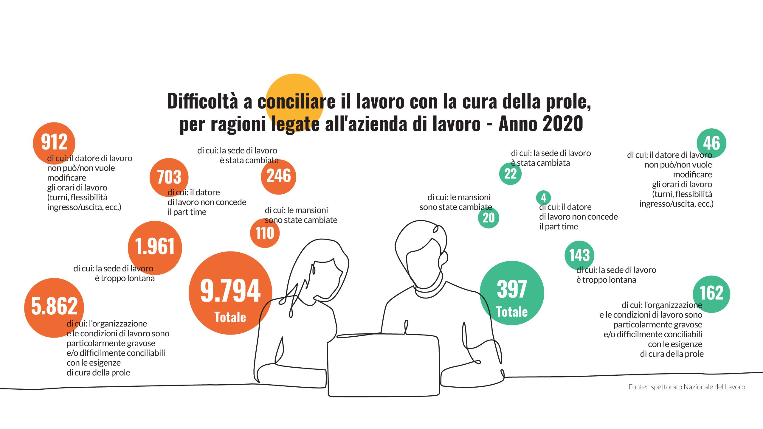Sulle oltre 19 mila segnalazioni di difficoltà di conciliazione per motivazioni legate ai servizi di cura, il 98% proviene da donne, mentre sulle oltre 10 mila segnalazioni di difficoltà per motivazioni legate all’organizzazione del lavoro, la quota al femminile si attesta al 96%. Per gli uomini, la motivazione di gran lunga prevalente è il passaggio ad altra azienda.